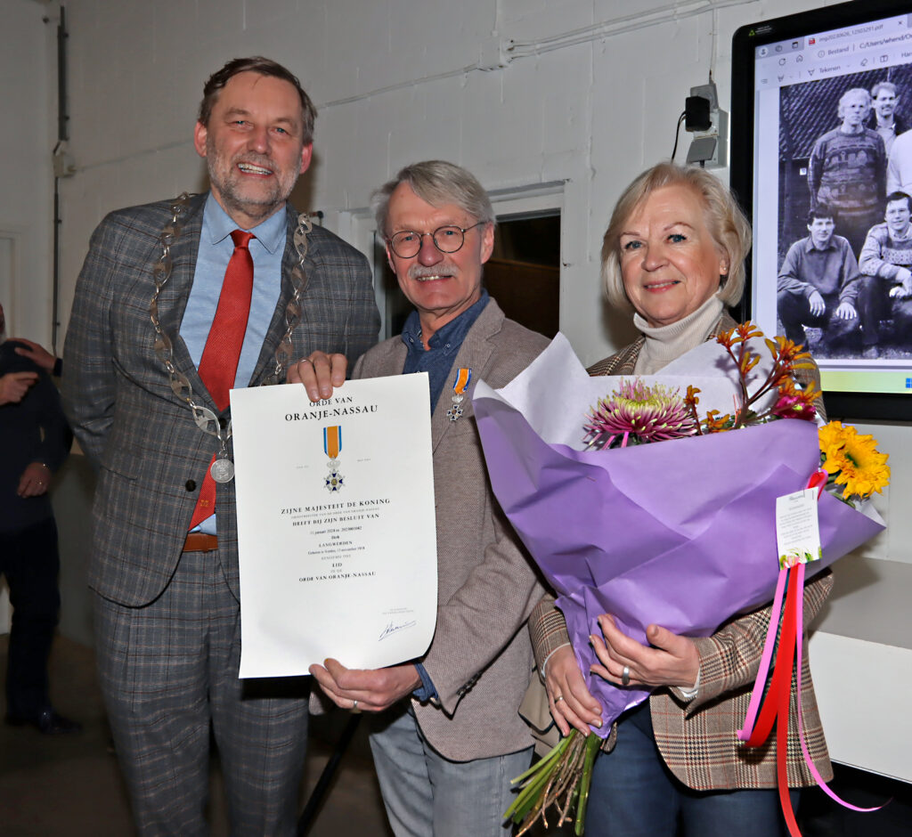 De burgemeester richt het woord tot Dick en langzaam maar zeker wordt het duidelijk, dat het gaat uitdraaien op het uitreiken van een Koninklijke Onderscheiding. In zijn toespraak benoemt de burgemeester de verdiensten van Dick voor het kerkuilenbeschermingswerk in onze regio. Hij was een van de oprichters van de werkgroep Achterhoek Liemers in 1984, al 40 jaar actief als werker in het veld, vele jaren voorzitter van de werkgroep geweest en een inspirator en verbinder voor de rest van de werkgroep.